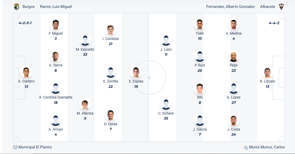 Albacete cũng đang chơi không tốt ở mùa này khi chỉ có được vị trí thứ 16 ở thời điểm hiện tại, tệ hơn so với thứ 13 mùa giải trước. Với vị trí và số điểm như hiện tại thì đội bóng của HLV Alberto González vẫn còn nguy cơ xuống hạng nếu như không làm tốt trong các trận cuối cùng của mùa giải. Albacete cần tiếp tục giành chiến thắng sau khi có 3 điểm ở vòng đấu trước, tuy nhiên chuyến làm khách trên sân của Burgos được đánh giá không hề dễ dàng. Nhiều khả năng Albacete sẽ không thể có điểm ra về dù chơi đầy cố gắng.