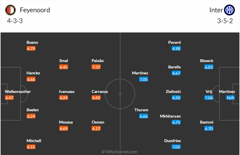 Dự đoán tỉ số trận đấu: Feyenoord 0 – 2 Inter (Chọn Inter và Xỉu trận).