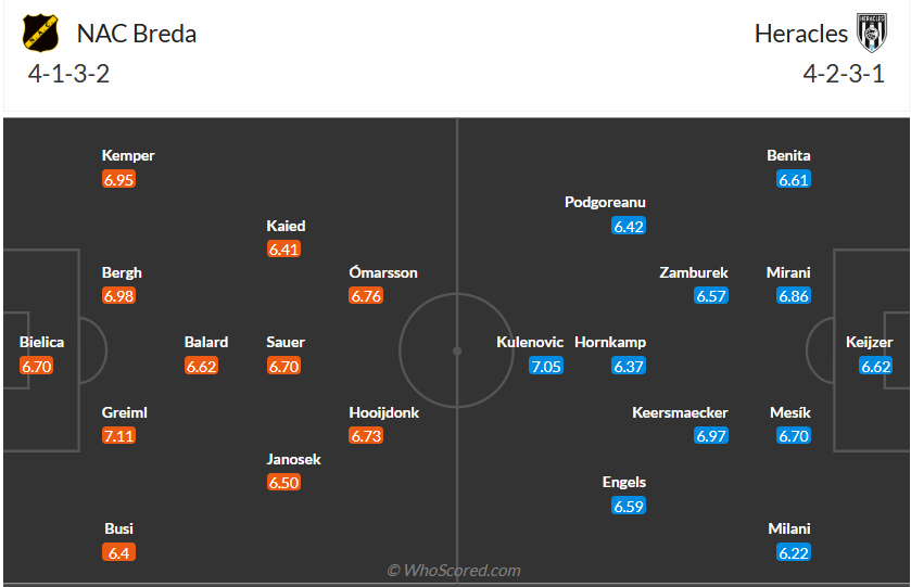 NAC Breda chỉ đứng thứ 8 ở giải đấu hạng dưới mùa trước nhưng họ lại là đội có chiếc vé thăng hạng cuối cùng để lên chơi tại hạng đấu cao nhất của Hà Lan. Mục tiêu của thầy trò HLV Carl Hoefkens sẽ chỉ là trụ hạng và họ đang làm tốt nhiệm vụ này khi đang đứng thứ 9 ở thời điểm mùa giải đã được hơn 1 nửa chặng đường. Phong độ của NAC Breda thời gian gần đây là không hề tốt khi thua 4/6 vòng gần nhất và họ cần duy trì sự ổn định cần thiết để sớm đủ điểm trụ hạng. Chính vì vậy họ cần một kết quả có lợi khi đón tiếp Heracles ở vòng đấu thứ 20 này, nhiều khả năng lợi thế sân nhà sẽ chỉ giúp NAC Breda có 1 điểm khi mà đội khách không phải đội bóng yếu.