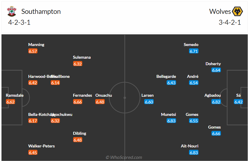 Wolves đang đứng thứ 17 trên bảng xếp hạng, vị trí chưa an toàn để trụ hạng. Tuy nhiên khoảng cách 6 điểm với vị trí thứ 18 cũng đủ lớn để các cầu thủ Wolves tạm yên tâm, họ vẫn cần có thêm những điểm số để sớm chắc chắn trụ hạng mùa giải này nên đương nhiên muốn có chiến thắng. Chỉ phải đến làm khách trên sân của đội cuối bảng Southampton là cơ hội tốt để Wolves có thêm 3 điểm nữa, nhiều khả năng trước đối thu đang có chuỗi trận vô cùng kém cỏi thì đội bóng của HLV Vítor Pereira sẽ có 3 điểm ra về.